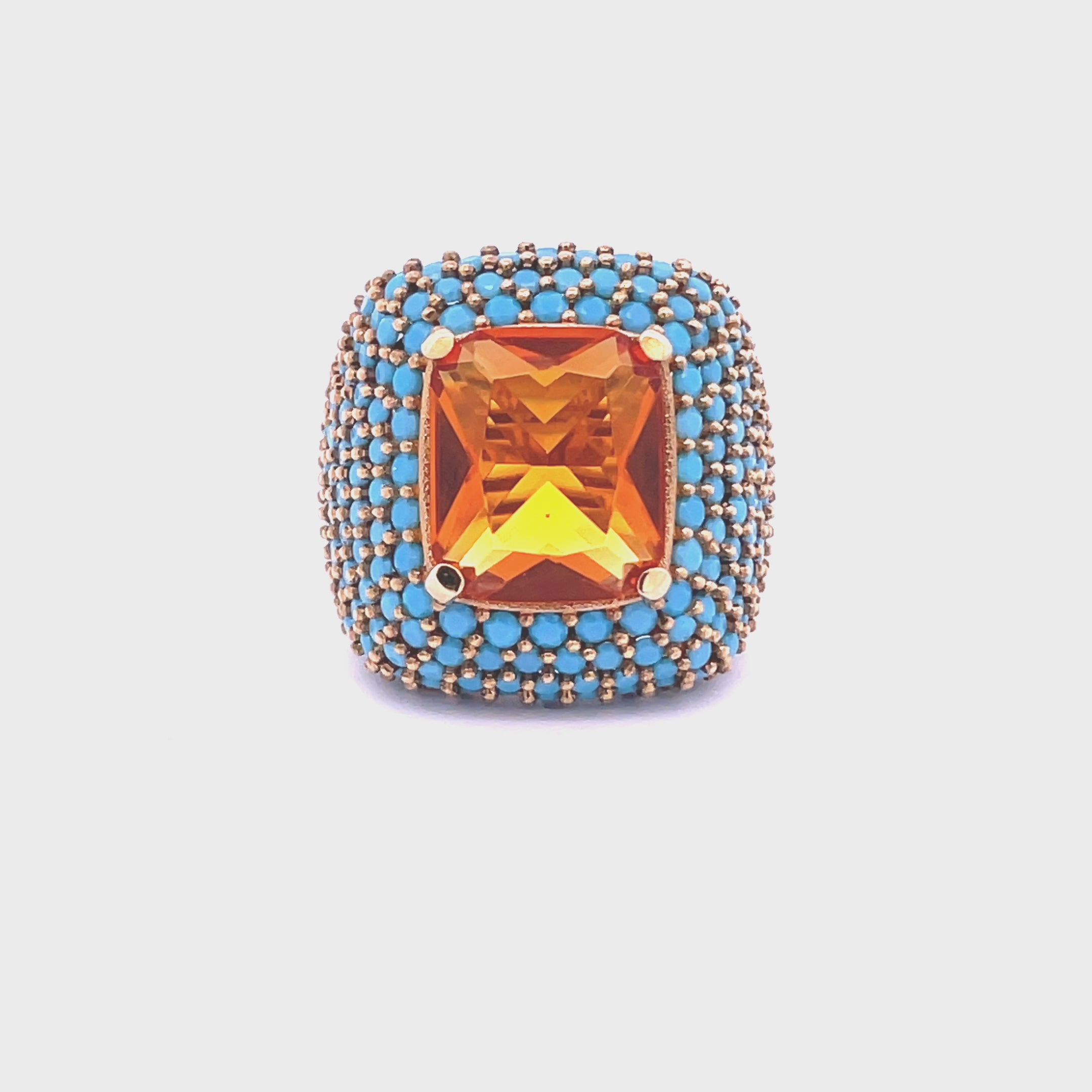 Een geelgoud vergulde ring, rijkelijk versierd met turkooisblauwe zirkonias, met in het midden een grote, diep citrine gele zirkonia.