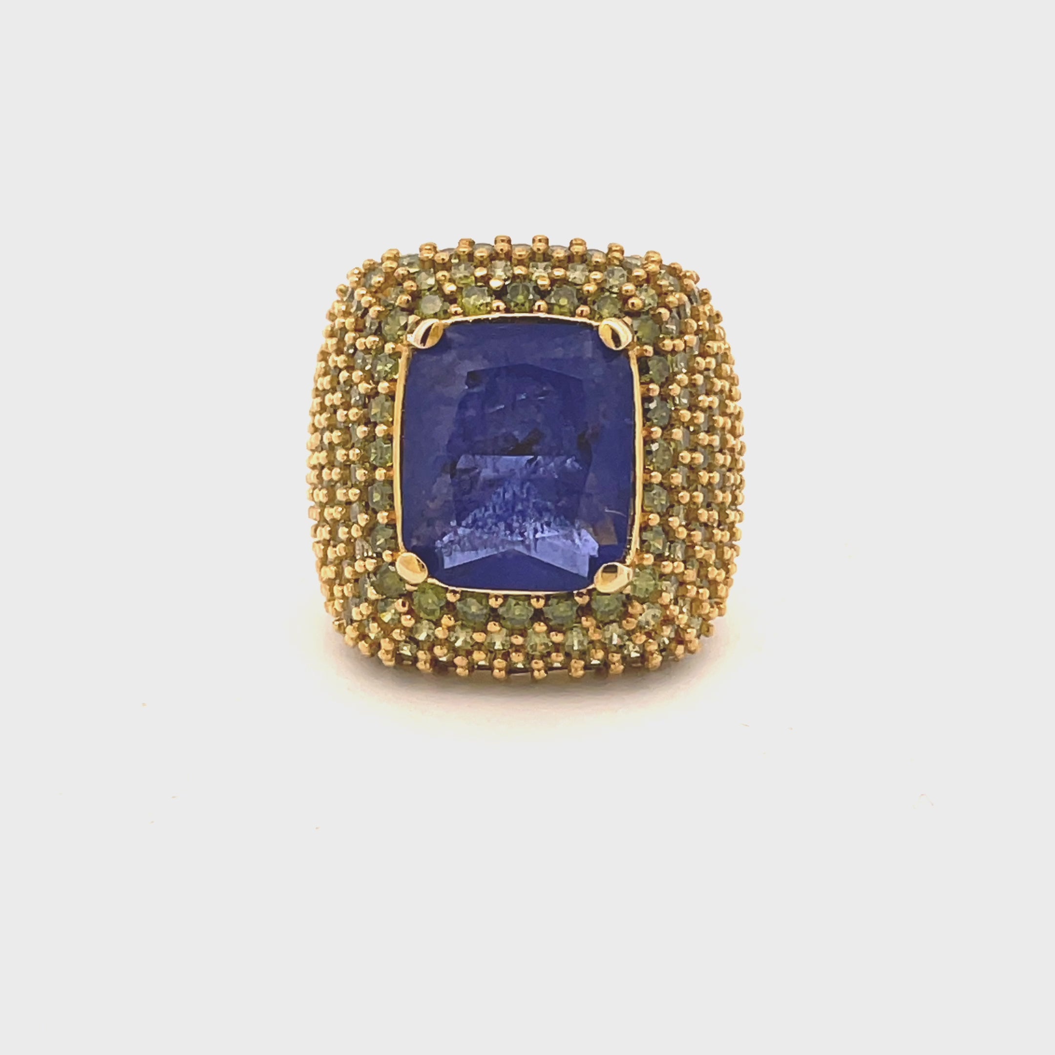 Een geelgoud vergulde ring, rijkelijk versierd met peridot groene zirkonias, met een grote diepblauwe doublette in het midden.