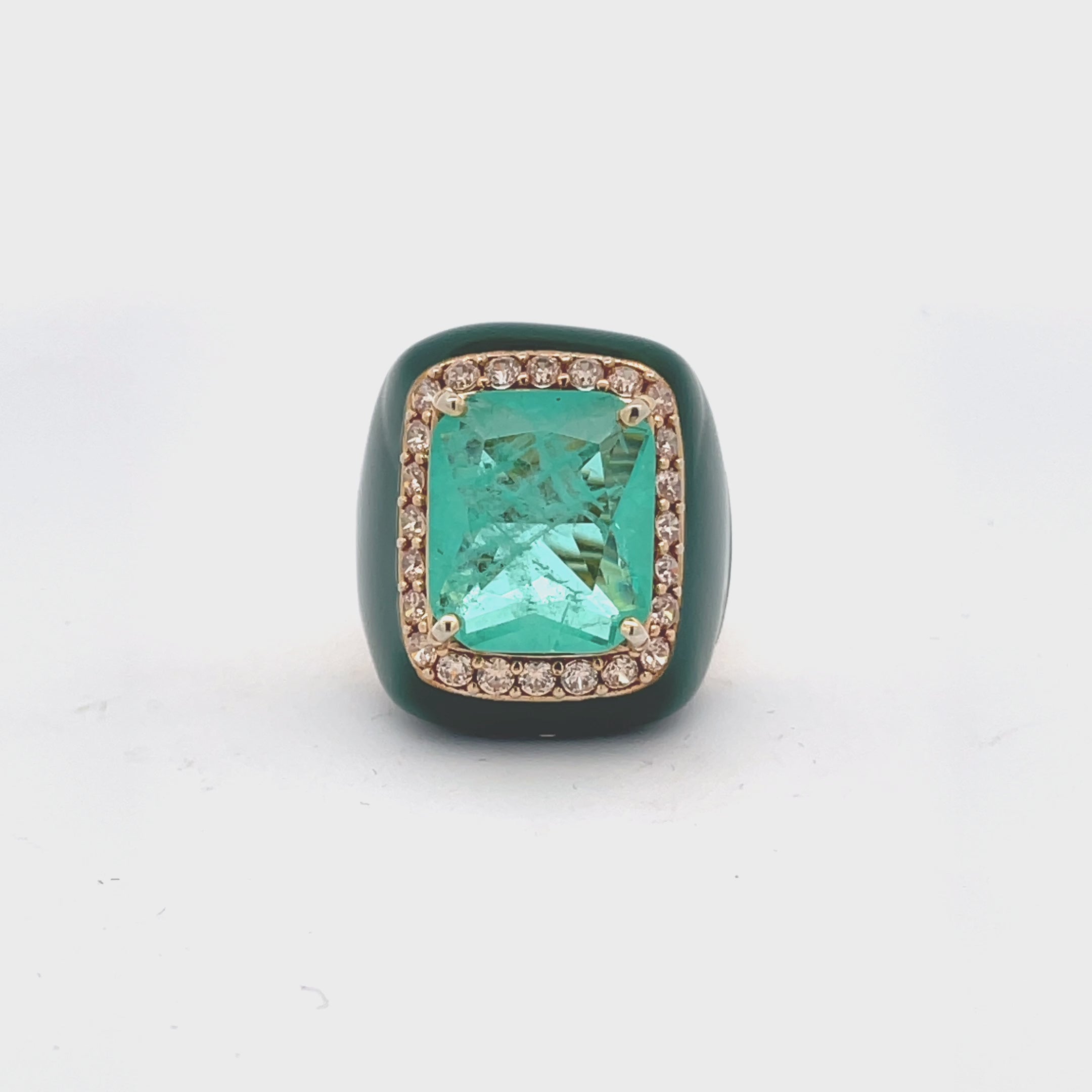 Een geelgoud verguld ring, versierd met donkergroen emaille, een grote aquagroene doublette omringd door champagne zirkonias.