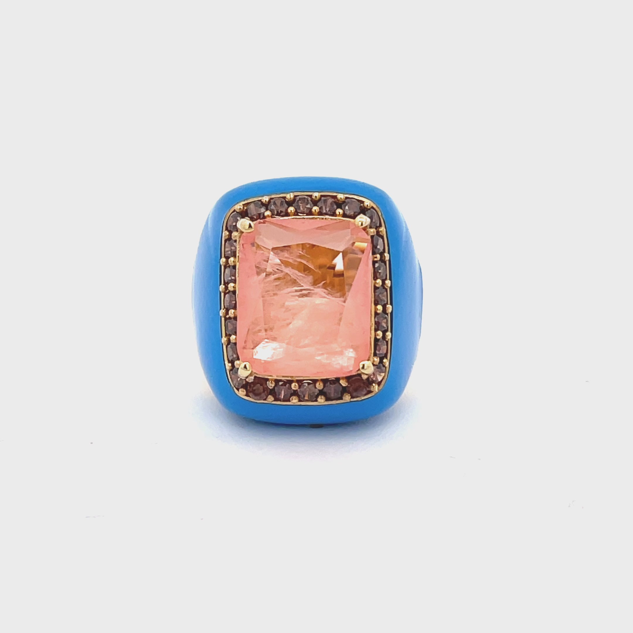 Een geelgoud vergulde ring, versierd met hemelsblauw emaille, een grote roze champagne doublette omgeven door bruine zirkonias.
