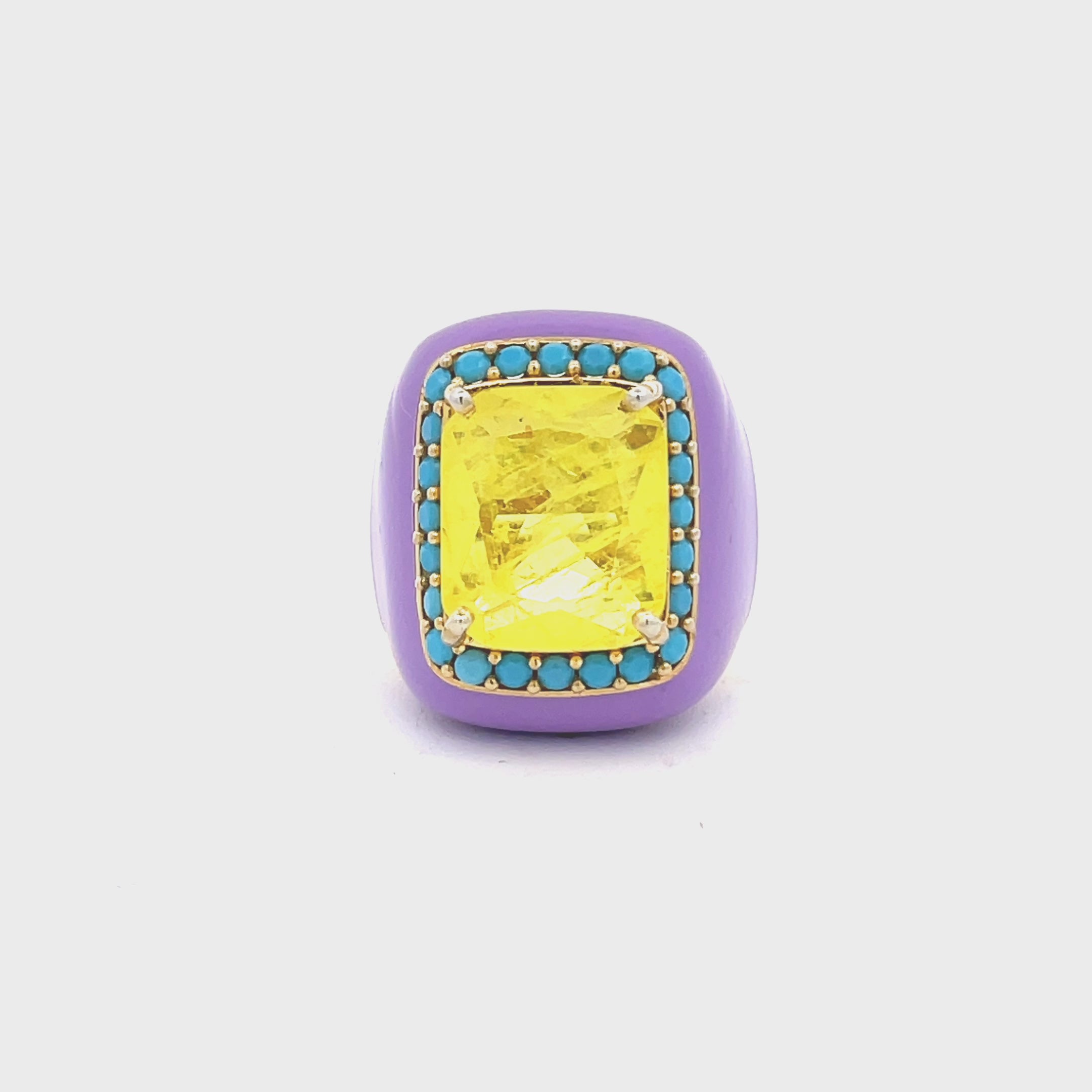 Een geelgoud verguld statementring, versierd met lila emaille, een grote gele doublette omgeven door turquoise blauwe zirkonias.