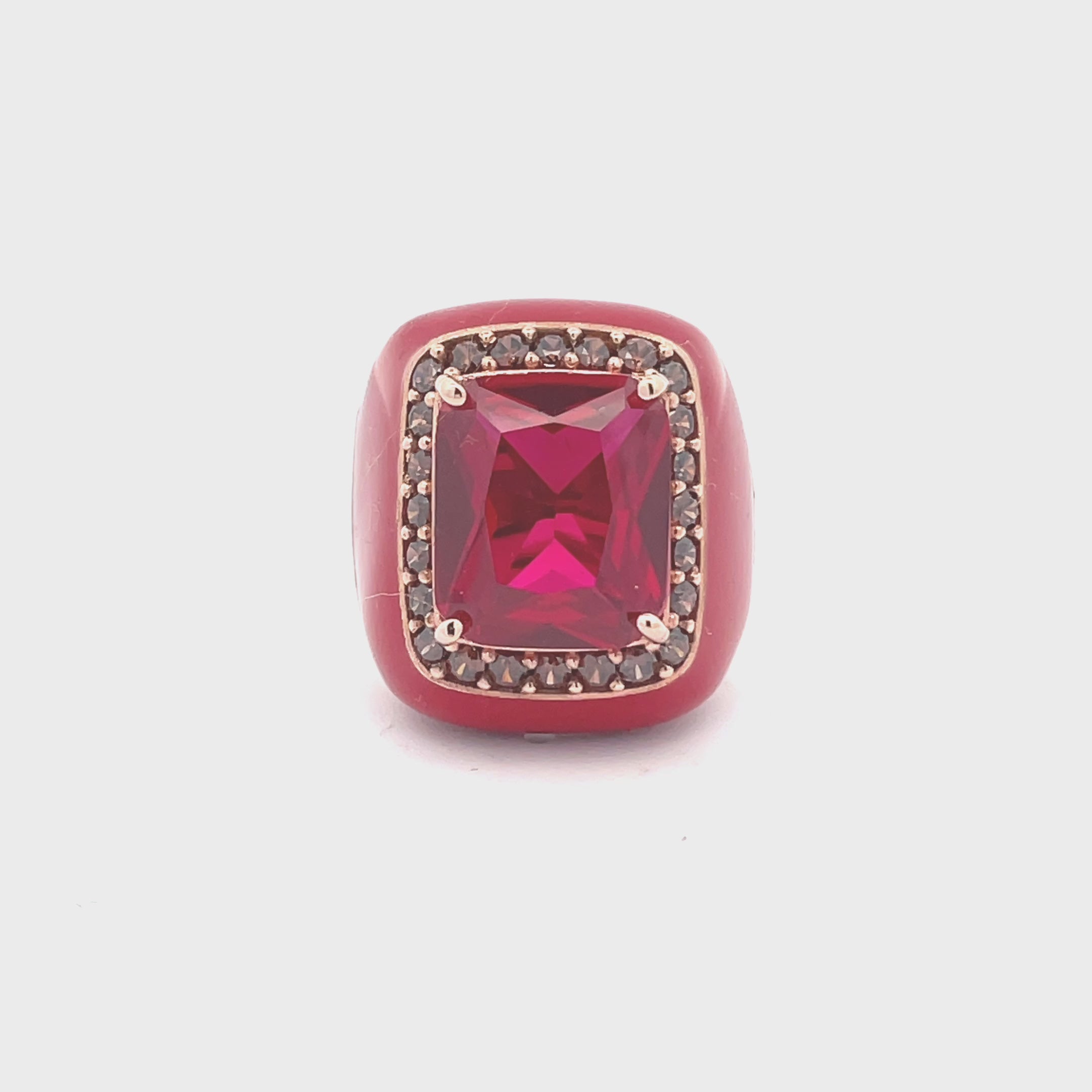 Een roségoud vergulde statement ring, versierd met bloedrood emaille, een grote bloedrode zirkonia omgeven door bruine zirkonias.