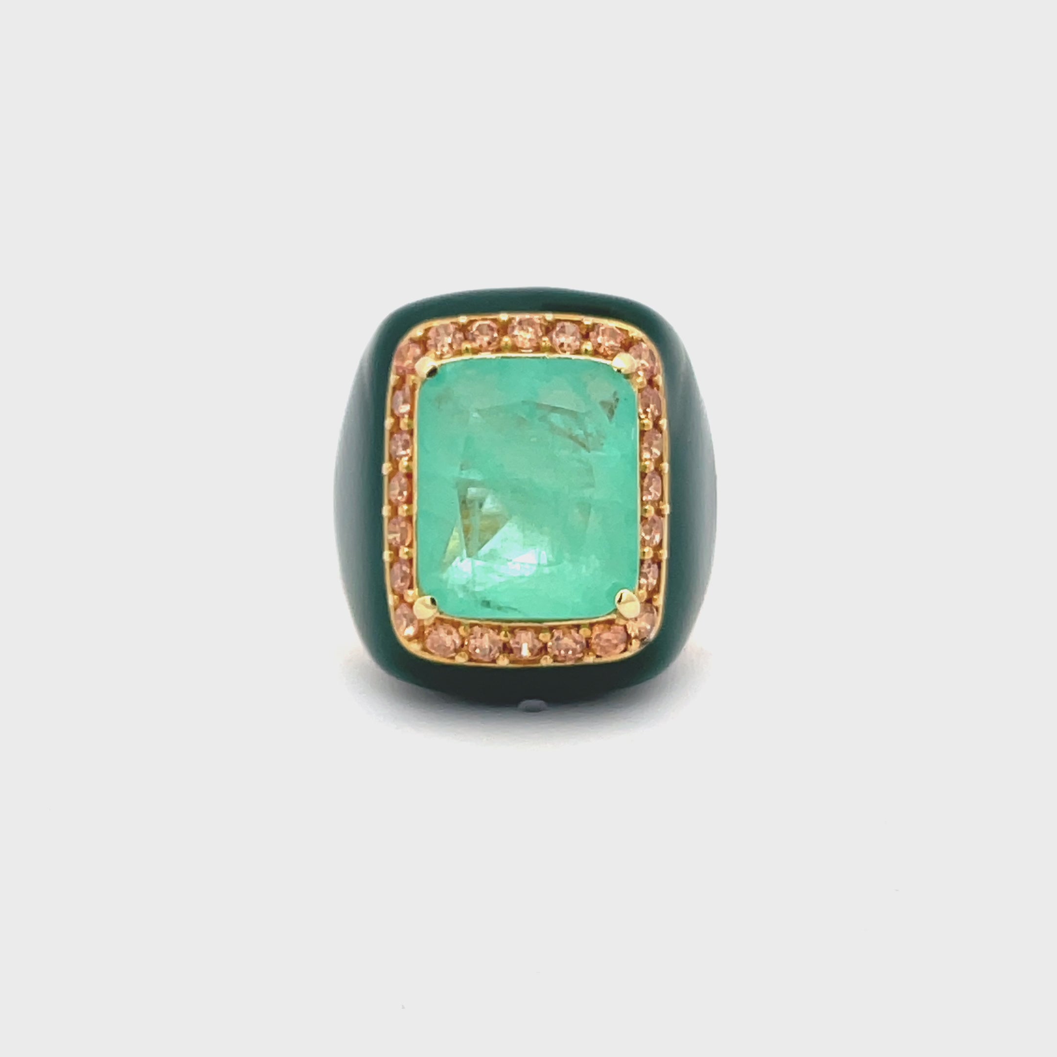 A yellow gold plated ring, adorned with dark green enamel, a large aquamarine green zirconia surrounded by champagne cubic zirconias.