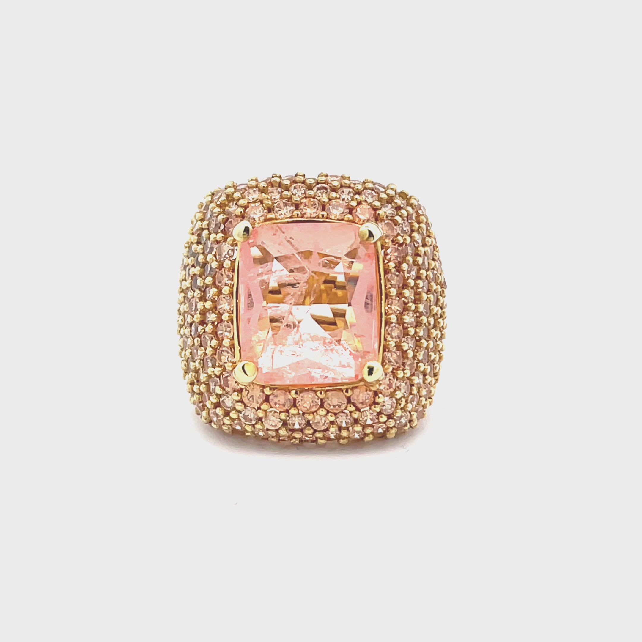 A yellow gold plated ring, lavishly adorned with champagne cubic zirconia stones, featuring a large champagne pink doublette in the center.