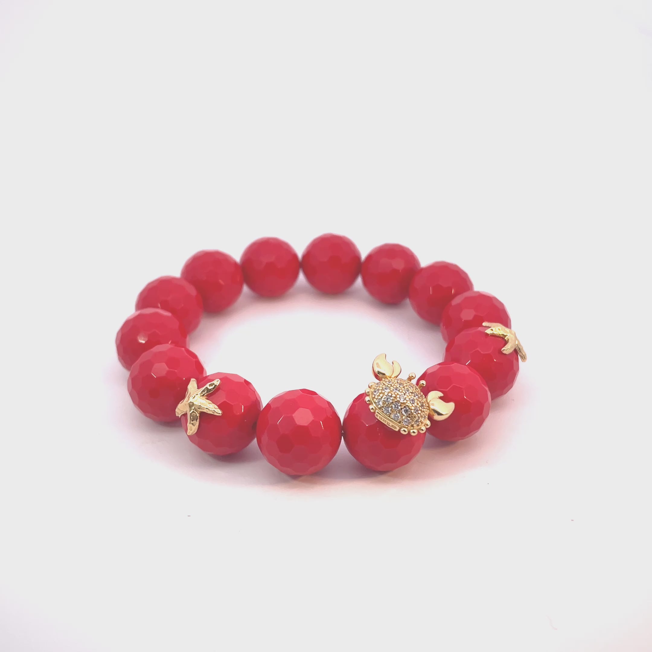 This stunning coral red beaded bracelet features a playful design with golden accents. The vibrant color and unique shapes make it a perfect accessory for any outfit, adding a touch of fun and elegance. Ideal for both casual and formal occasions, this bracelet is a must-have for your jewelry collection. Wear it alone or stack with other colors.