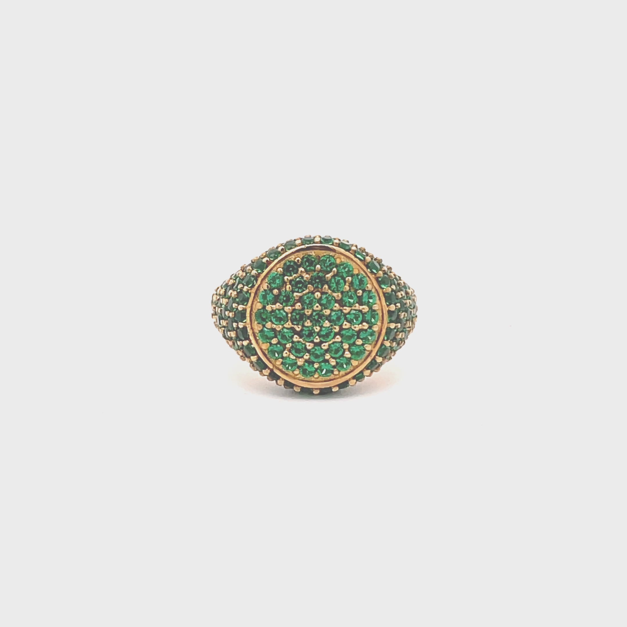 Yellow gold plated pinky ring, top and sides adorned with green zirconias.