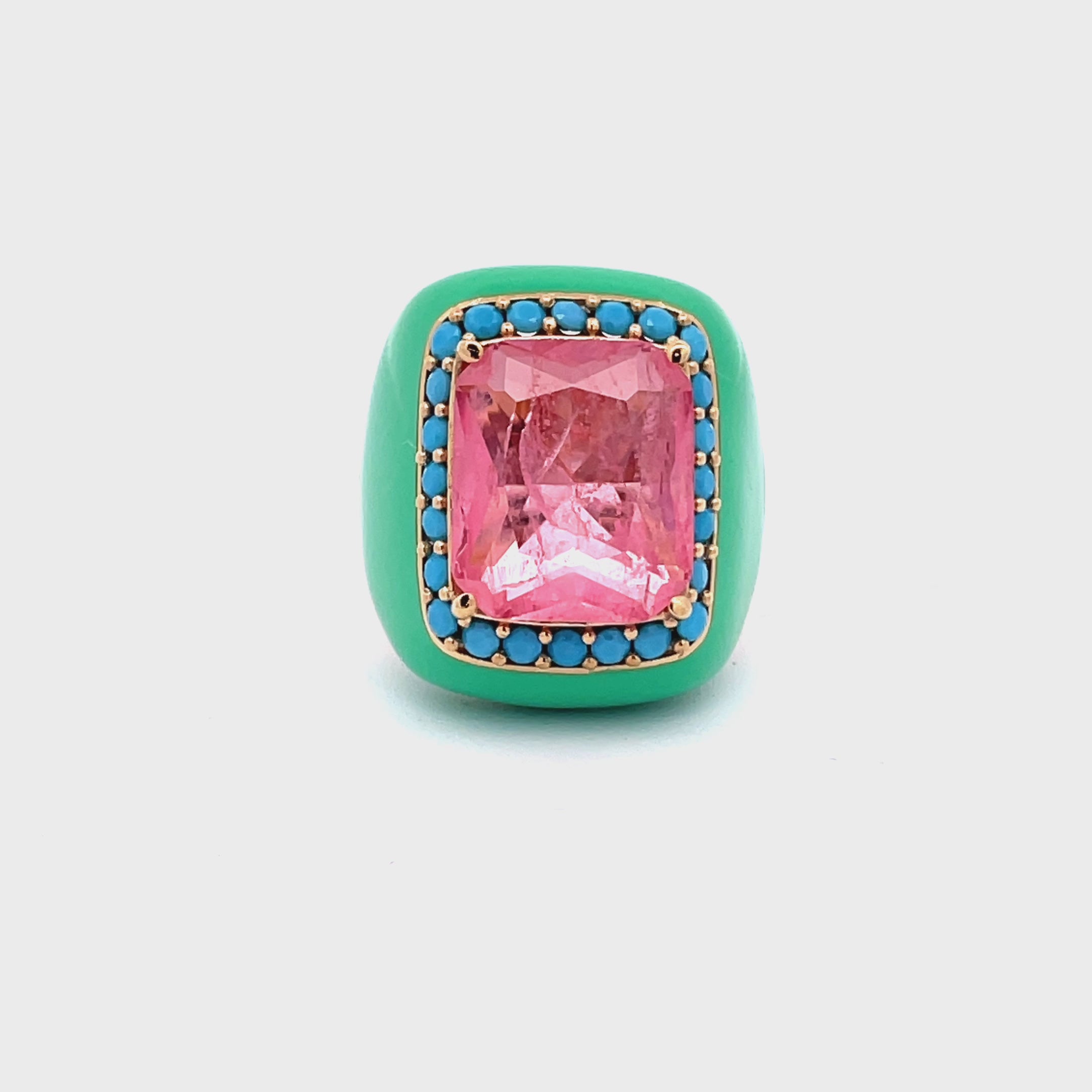 A yellow gold plated ring, adorned with mint green enamel, a large pink doublette surrounded by turquoise blue cubic zirconias.