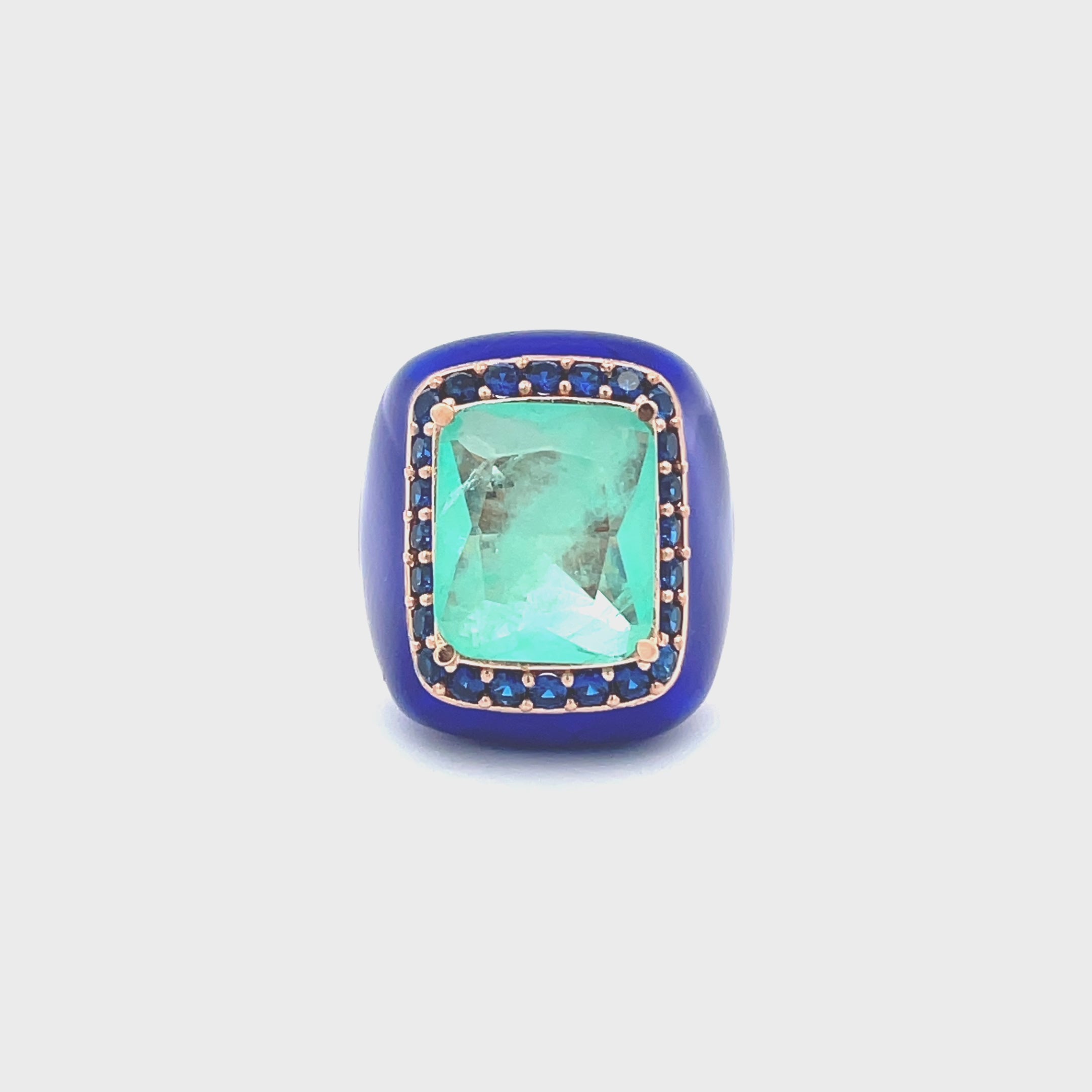 A rose gold plated ring, adorned with deep blue enamel, a large aquamarine green doublette surrounded by dark blue cubic zirconias.