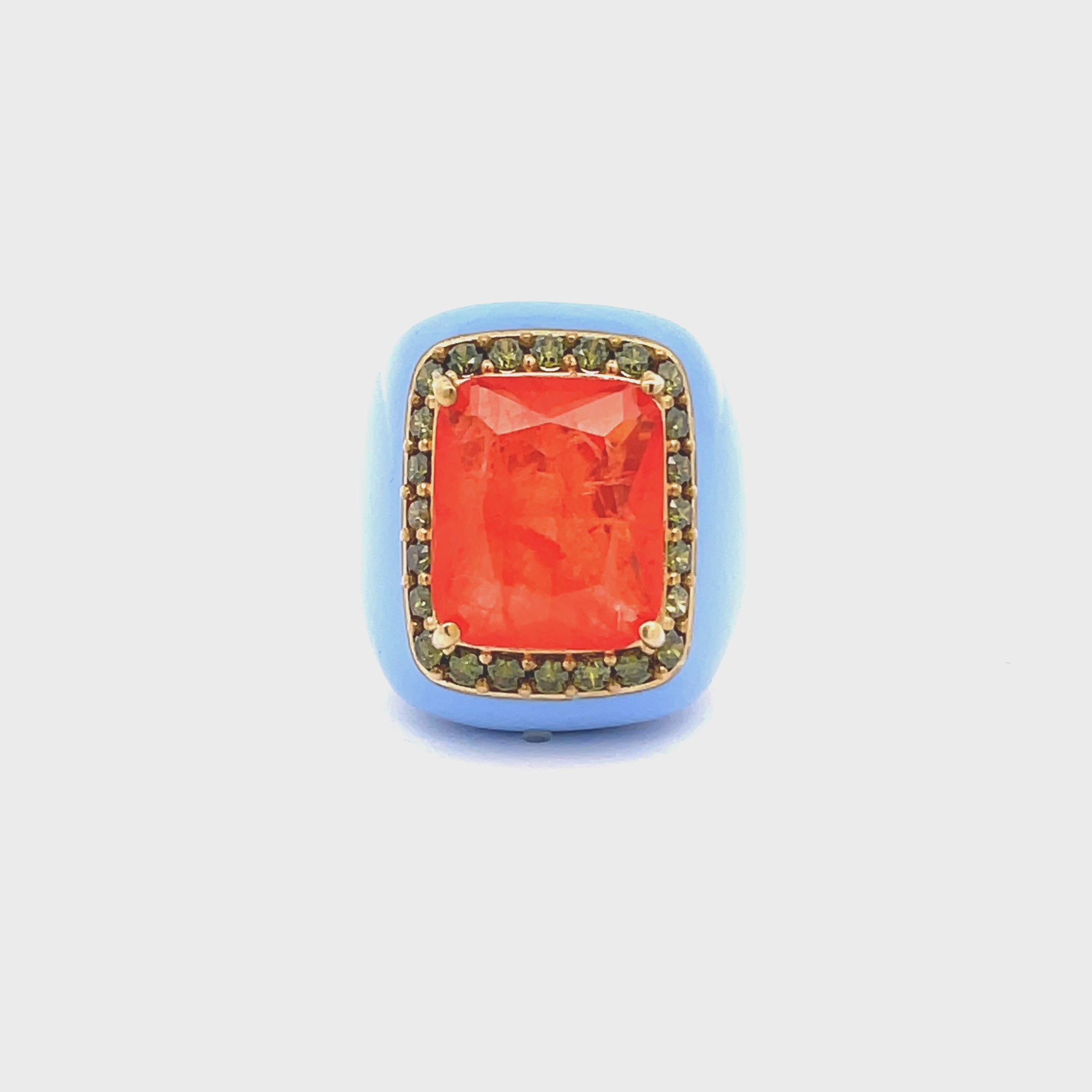 A yellow gold plated ring, adorned with light blue enamel, a large orange doublette surrounded by peridot green cubic zirconias.