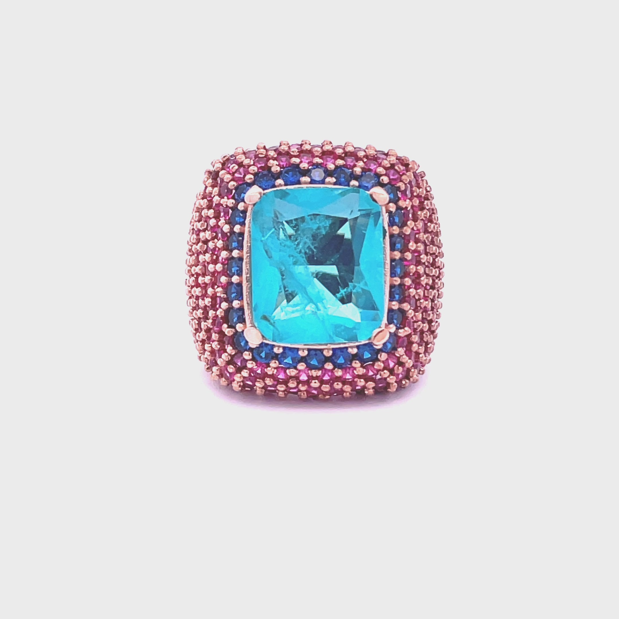 A rose gold ring, lavishly adorned with pink cubic zirconia stones, featuring a large turquoise blue doublette in the center.