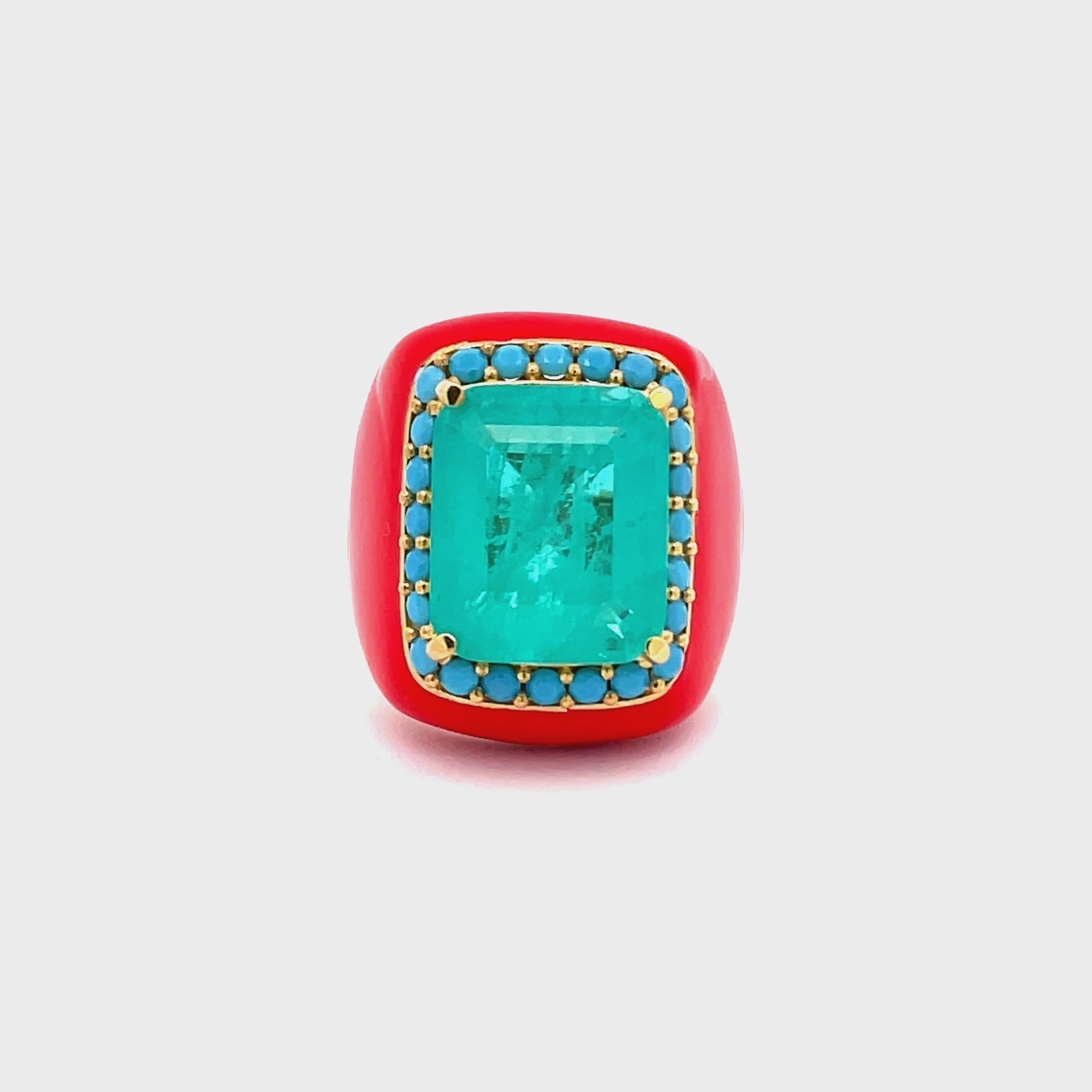 A yellow gold plated ring, adorned with Ferrari red enamel, a large turquoise blue doublette surrounded by turquoise blue cubic zirconias.