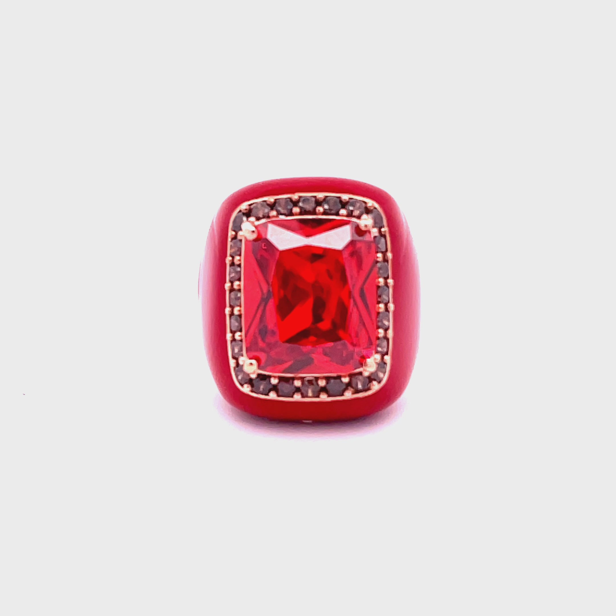 A rose gold plated ring, adorned with blood red enamel, a large rubellite red zirconia surrounded by brown cubic zirconias.