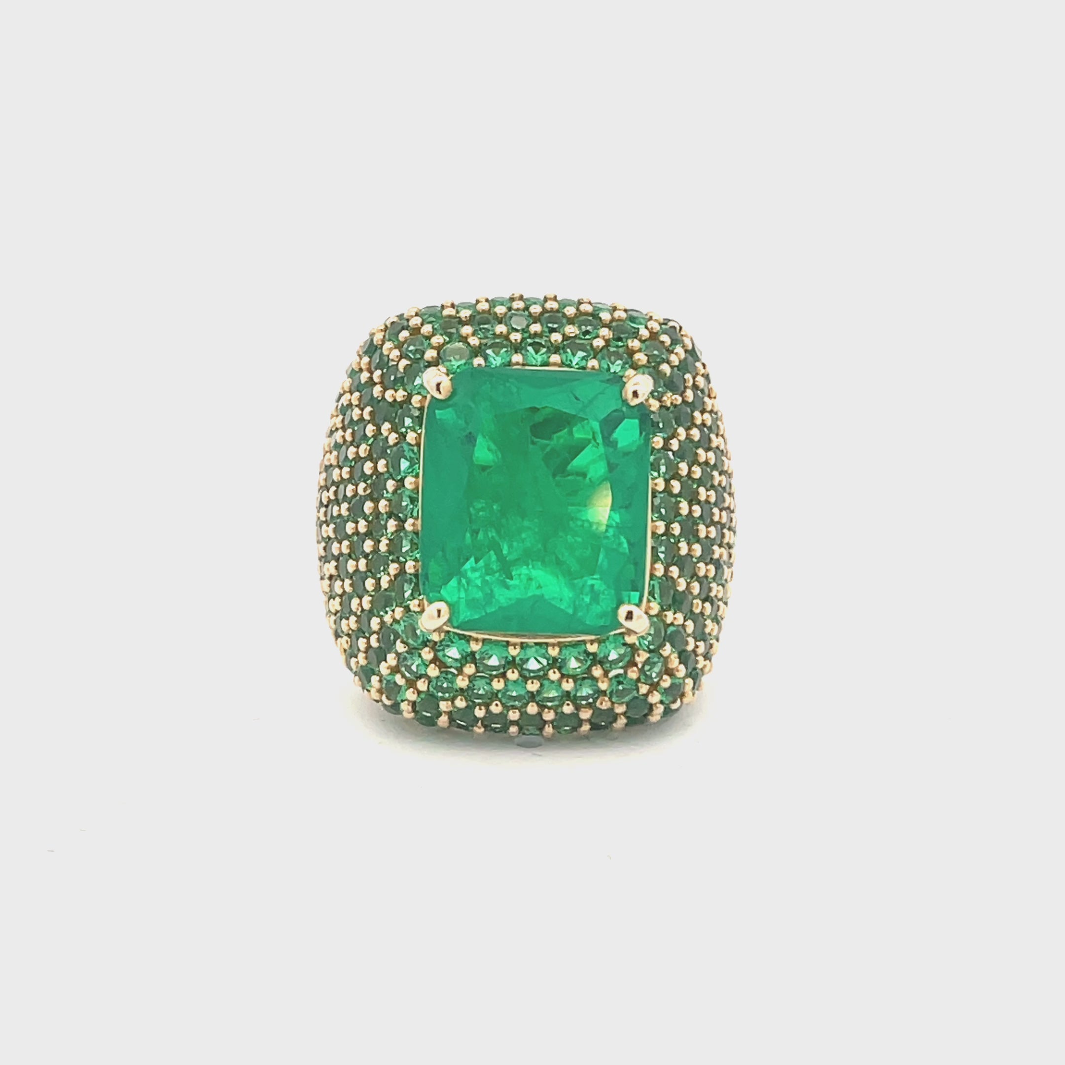 A yellow gold plated ring, lavishly adorned with emerald green cubic zirconia stones, featuring a large emerald green doublette in the center.